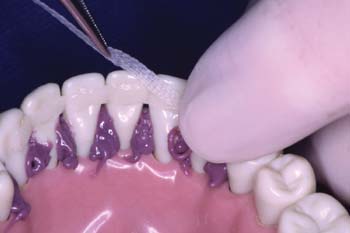 Prepare las áreas interproximales linguales y labiales para el cementado. Limpie los dientes con un chorro de arena, pasta de profilaxis o utilice una fresa de diamante para raspar el esmalte antes de limpiar el diente. Las tiras de pulido se pueden emplear para limpiar los espacios interproximales. Prepare los dientes con su técnica de adhesión habitual, (piedra pómez, grabado con ácido, y una fina capa de adhesivo dentinario).