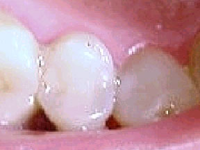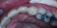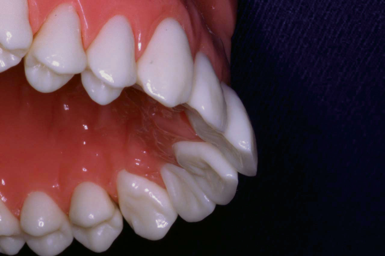 Si no se coloca el composite en las superficies vestibulares de las áreas interproximales creando un reborde de 180 grados para estabilizar los dientes, las fuerzas que afectarán a la férula durante la función masticatoria puede causar que el diente se separe de la férula. Este es un ejemplo de una férula donde el diente se ha separado debido a inadecuada aplicación del composite sobre la superficie vestibular.