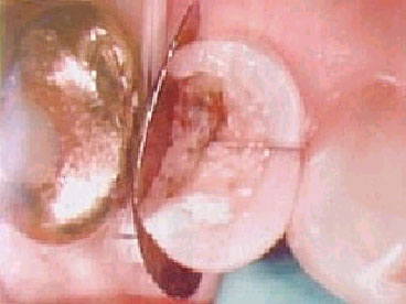 Se realizó una profilaxis vestibular y lingual utilizando una copa y pasta de piedra pómez. Los dientes se aclararon y secaron completamente. Las superficies interproximales se limpiaron utilizando fresas de diamante finas y CeriSander (Den-Mat Santa Maria, CA) una tira de diamante para acabado de grano medio sujeta en una segueta.