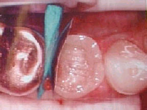 Se aislaron los dientes para el procedimiento clínico con un dique de goma. Debido a la movilidad de los dientes y la separación de los mismos el tratamiento fue fácil de aplicar