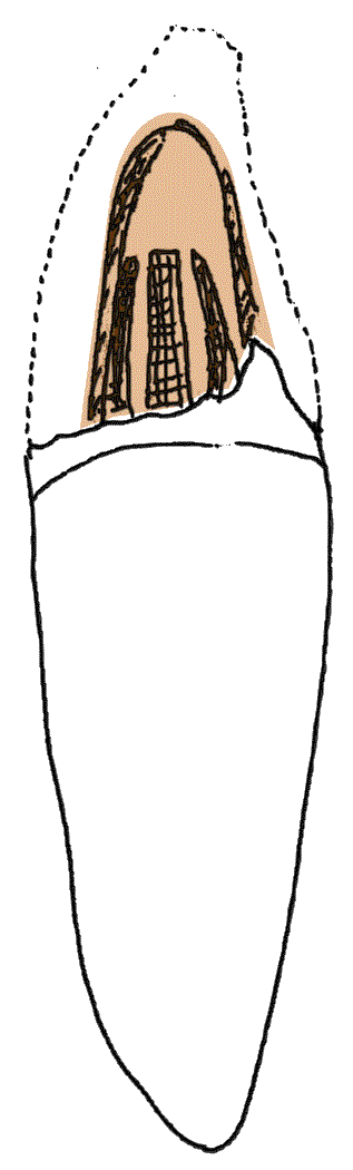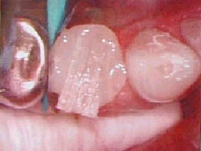 En el área del canino faltante, se colocó una doble pieza de Ribbond para proporcionar fuerza estructural al área del póntico. La segunda parte de la fibra se extendió dentro de la cámara pulpar de los premolares tratados endodónticamente.