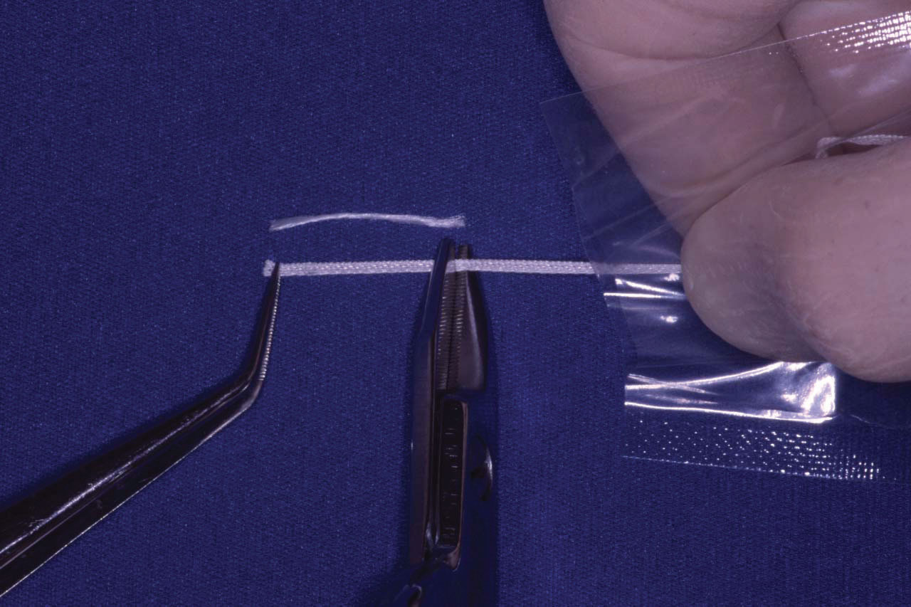 Para determinar la longitud de Ribbond necesaria se puede utilizar un trozo de hilo dental colocándolo de distal a distal de la férula, ya sea en un modelo o directamente sobre los dientes. El hilo dental se adaptará a la superficie lingual. La longitud de hilo determinada servirá de modelo para cortar el tamaño de Ribbond necesario. Es importante utilizar las tijeras especiales porque las fibras de polietileno son muy duras y resistentes al corte incluso al de otras tijeras dentales muy afiladas.