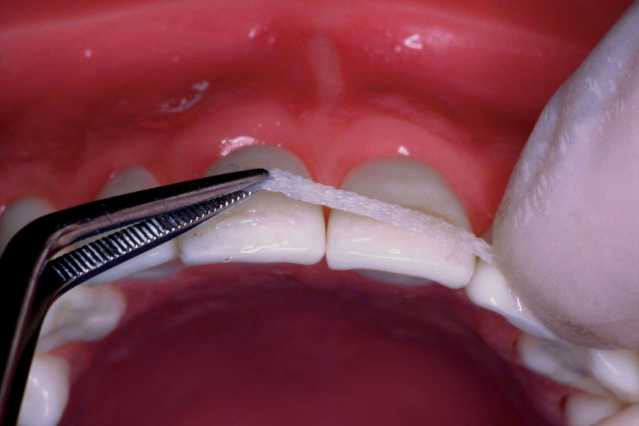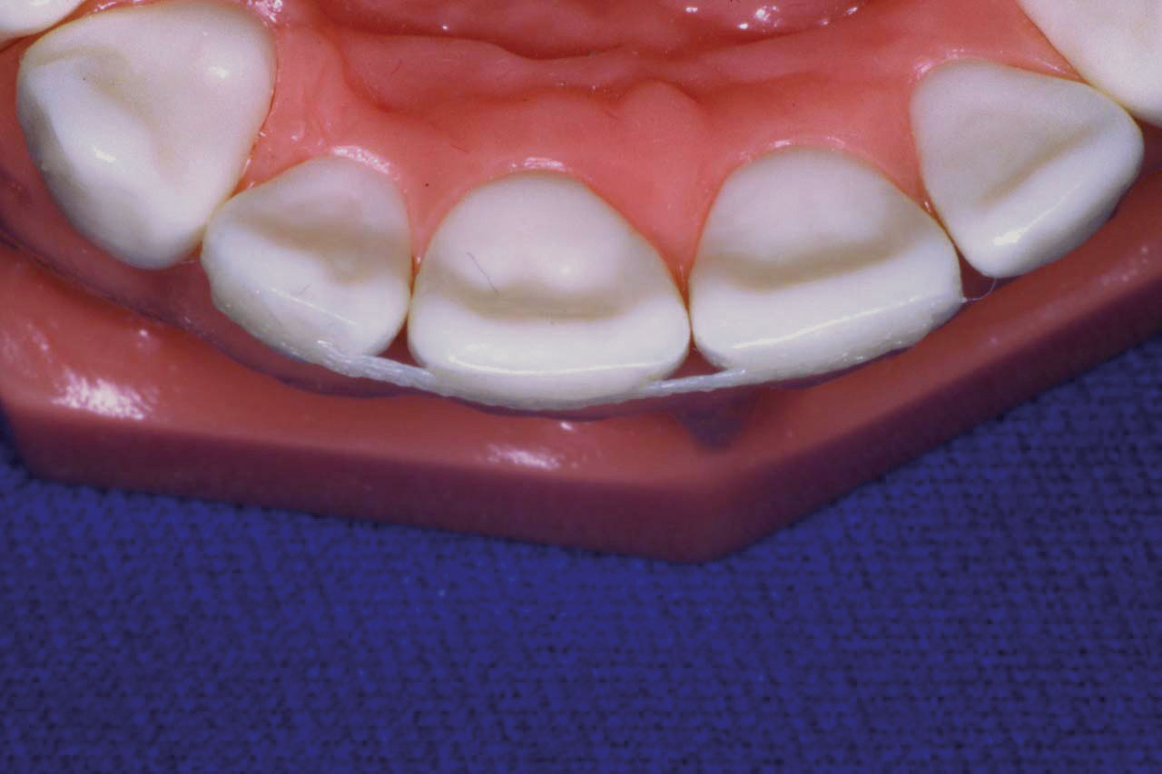 La longitud necesaria de Ribbond se determinó mediante la colocación de un trozo de hilo dental entre los puntos distales de la férula. El hilo dental se adaptará a la superficie facial. Se corta la longitud del hilo actuando como plantilla.