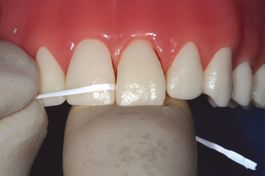 Cuando el área de las troneras gingivales es muy ajustada puede ser necesario bloquearla para poder retirar los restos del composite en menos tiempo. Una técnica conveniente es utilizar un polisiloxano automezclable (silicona de adición) aplicando este material de impresión en los espacios interproximales gingivales. Es muy importante que los dientes se graben y se sequen antes de utilizar esta técnica de bloqueo.