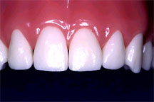 Observese que se dió nueva forma a la superficie mesial del incisivo central para mejorar la estética en comparación con el incisivo lateral adyacente. La paciente comentó que podía volver a comer con los dientes delanteros sin ningún dolor. Los dientes no presentan ninguna movilidad.
