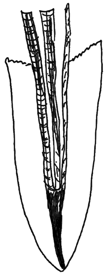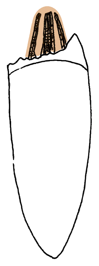 El diente fue tratado endodónticamente con apexificación utilizando hidróxido de calcio y luego se rellenó con gutapercha. Observe el gran espacio del canal y la delgada estructura interior del diente.