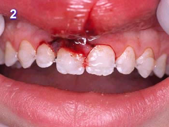 El colgajo fue recolocado y suturado. Observe la posición más apical del composite añadido a la encía en la superficie vestibular. Como parte del plan de tratamiento de las superficies vestibulares de los dientes se restaurarán con carillas de porcelana.