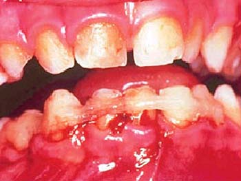 La queja principal de este paciente era la incomodidad durante el funcionamiento de los dientes anteriores inferiores. Nótese la pérdida y recesión de encía. Todos los incisivos tenían grado 2 de movilidad.